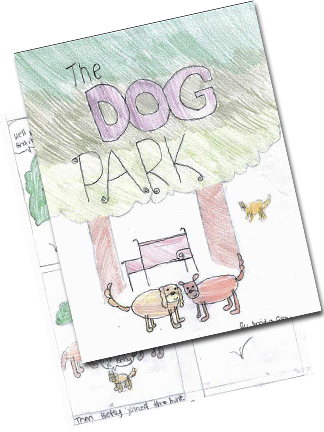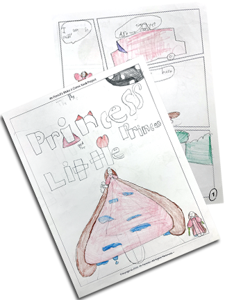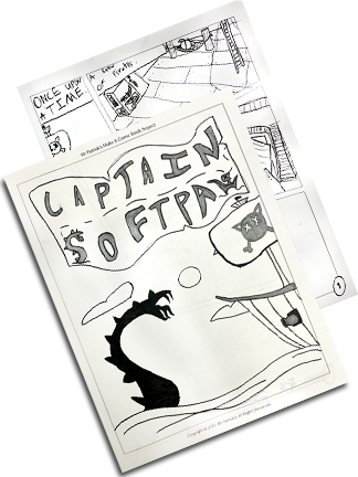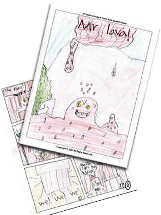 On the left, right and bottom are actual examples of completed comic books made by participants in my Intro to Cartooning & Comic Books classes and camps.