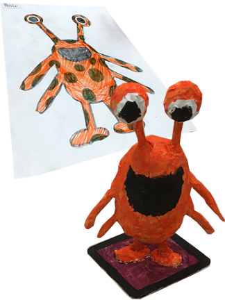 On the left, right and bottom are actual examples of completed projects made by participants in my 3D Sculpture classes and camps.