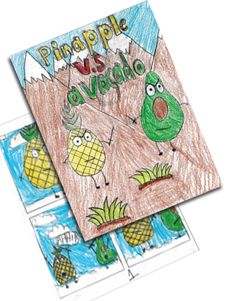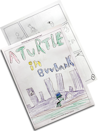 On the left, right and bottom are actual examples of completed comic books made by participants in my Intro to Cartooning & Comic Books classes and camps.
